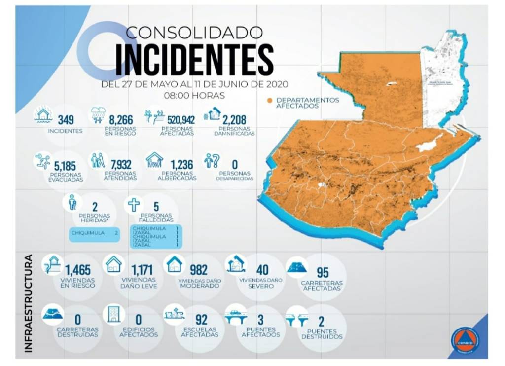 La Coordinadora Nacional para la Reducción de Desastres (CONRED), informó los eventos de este día por la temporada de lluvia.