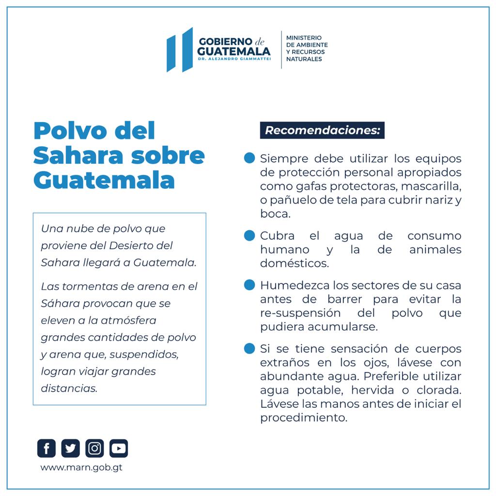 El Ministerio de Ambiente y Recursos Naturales (MARN), informa que uno de los aspectos positivos que tiene el polvo del Sahara durante su recorrido por los diversos países que atraviesa, es que lleva beneficios a la naturaleza, pues funciona como fertilizante natural en nuestras selvas y ecosistemas, así como en la recuperación de los suelos erosionados.