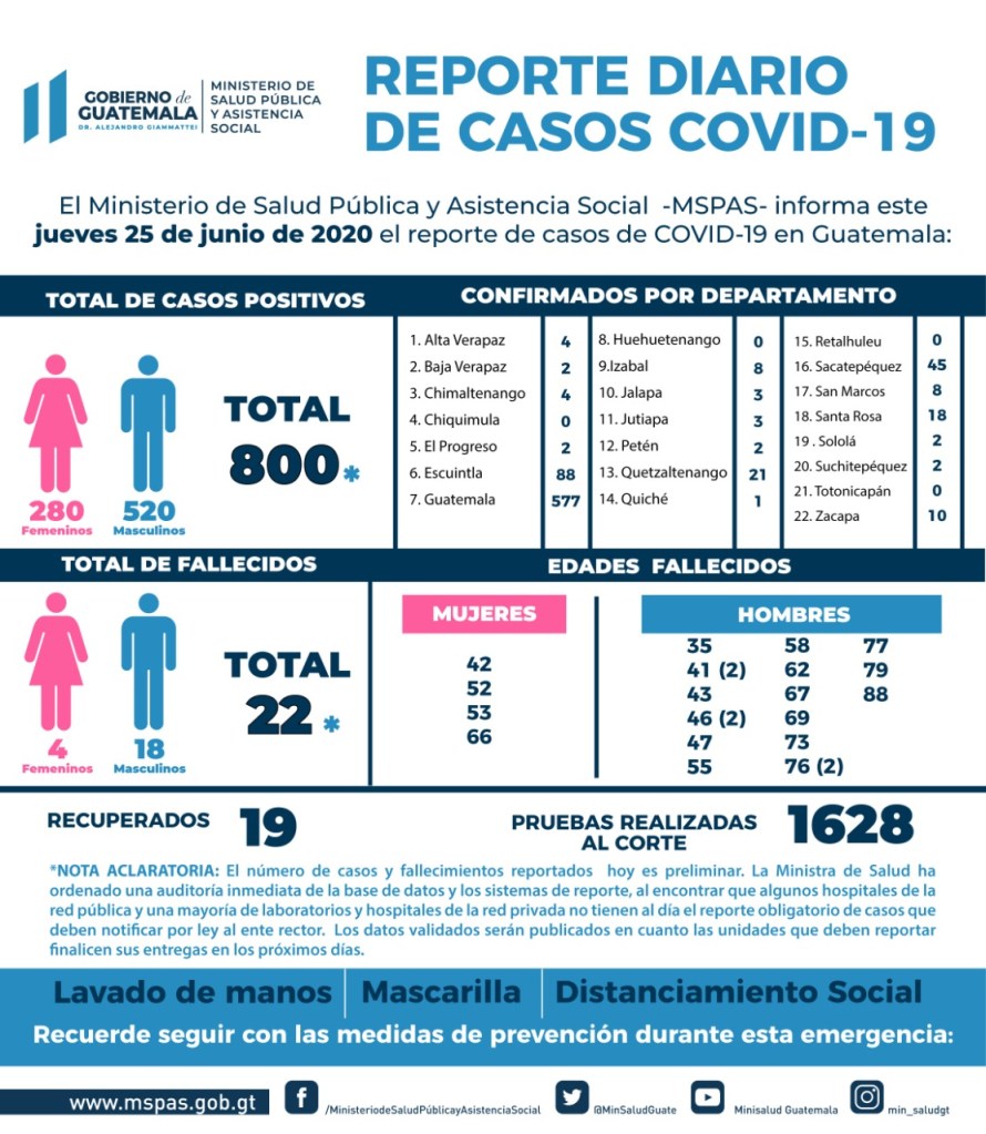 El Ministerio de Salud Pública y Asistencia Social, informó que este 25 de junio se confirmaron 800 personas positivas de COVID-19, 22 fallecidos, 18 recuperados y se hicieron 1 mil 628 pruebas.