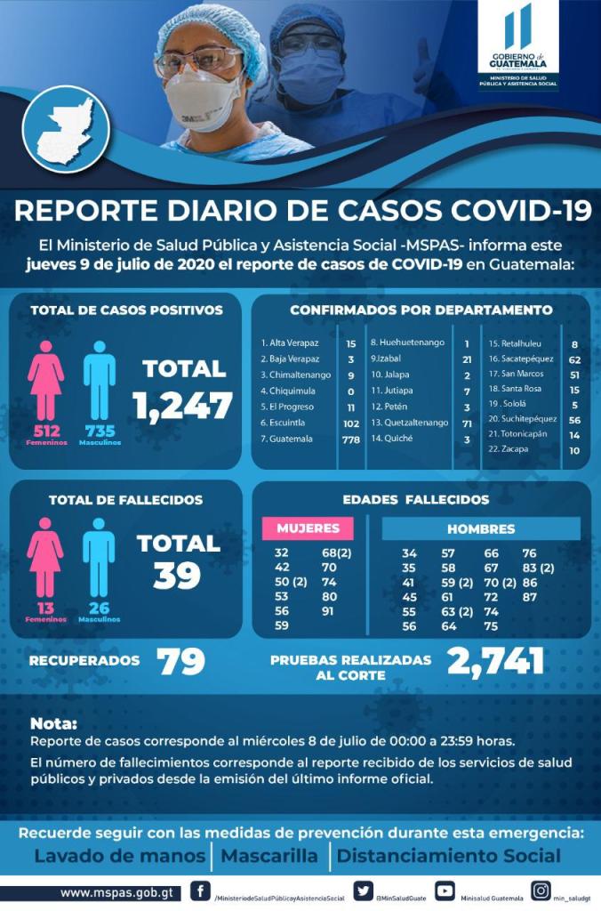 Según el reporte de casos positivos de COVID-19 en Guatemala, el jueves 9 de julio, el Ministerio de Salud Pública y Asistencia Social (MSPAS), confirmó 1 mil 247 positivos más en el país y 39 fallecidos.