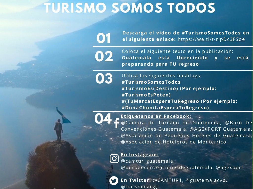 “Guatemala está floreciendo y se está preparando para tu regreso”, es el mensaje central del video promocional elaborado por el sector privado turístico organizado representado por la Cámara de Turismo de Guatemala (CAMTUR), sus filiales, gremiales y asociaciones, AGEXPORT por medio de su Comisión de Turismo Sostenible (COMITURS), Buró de Convenciones de Guatemala, la Asociación de Hoteleros de Monterrico y la Asociación de Pequeños Hoteles de Guatemala (APEHGUA).