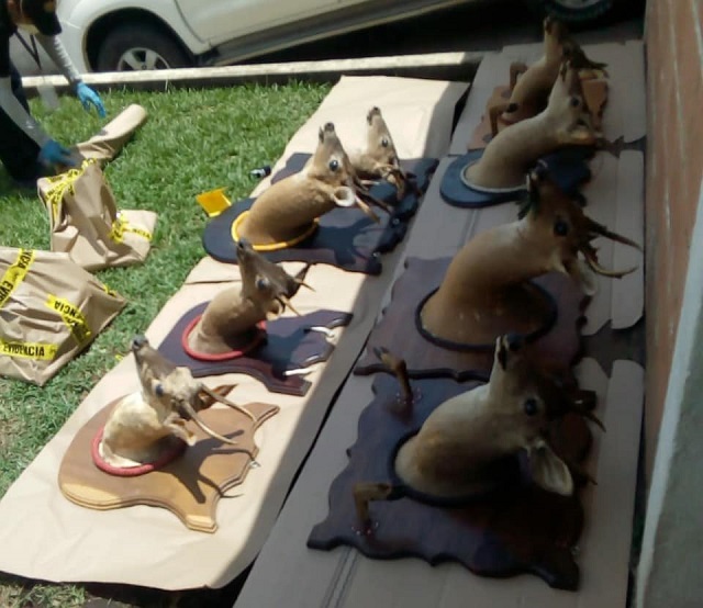 Vida Silvestre de la Dirección Regional Verapaces del Consejo Nacional de Áreas Protegidas (CONAP) apoyó a la Agencia Fiscal de Delitos contra el Ambiente de Cobán, Ministerio Público y Diprona, donde se realizó un allanamiento,. dando como resultado el decomiso de 12 cabezas de venados cola blanca, «Odocoileus virginianus» enmarcadas en madera, tres de ellas contaban con dos patas de la misma especie.