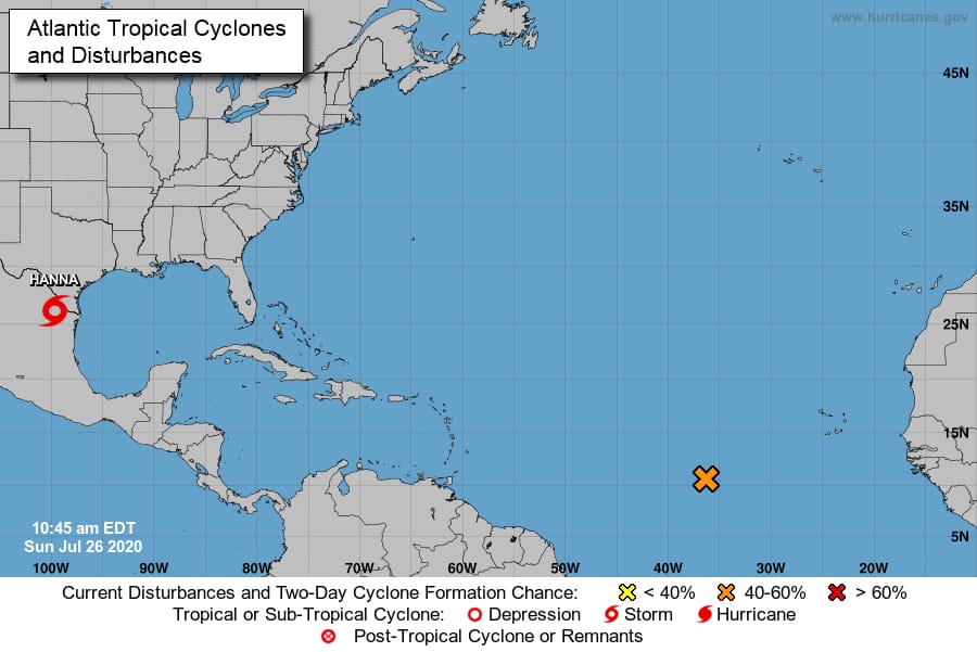 Monitoreo del Centro Nacional de Huracanes en el Atlántico, Hanna afectando México y Estados Unidos. Otro Sistema en el Atlántico entre 40 a 60 por ciento de probabilidades de fortalecerse.