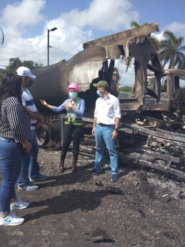 Para evitar el avance de la contaminación por derrame de combustible, luego del incendio de tres cisternas en la gasolinera de la Estación COMARSA, en Santo Tomás de Castilla, Izabal, el Ministro de Ambiente y Recursos Naturales, Mario Rojas Espino, realiza inspección en el área afectada.