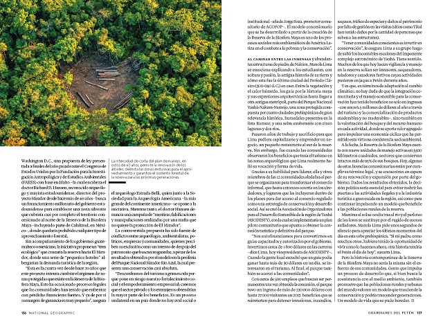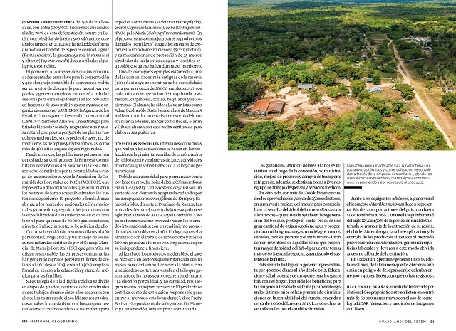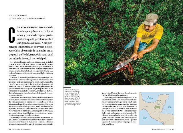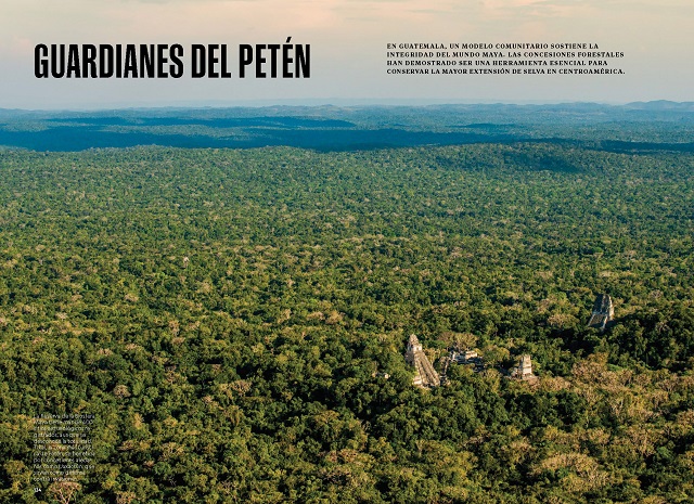 Con textos de Erick Pinedo, periodista mexicano especializado en temas ambientales, ciencia y exploración, e imágenes del fotógrafo y conservacionista guatemalteco Sergio Izquierdo, el reportaje de 14 páginas abarca las múltiples luchas que se han dado para resguardar el modelo forestal comunitario, incluyendo la situación actual relacionada a un proyecto de ley estadounidense que busca control sobre las zonas de El Mirador en Guatemala y Calakmul en México.