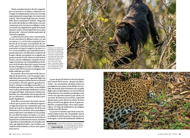El fotógrafo y cineasta Sergio Izquierdo comentó sobre la publicación “Llevo más de cinco años documentando Petén desde los distintos ángulos y puntos de vista. Me enorgullece realizar esta historia aportando un grano de arena en pro de la conservación, al mostrar la importancia de las concesiones forestales comunitarias para el cuidado de la biodiversidad de mi país.”
