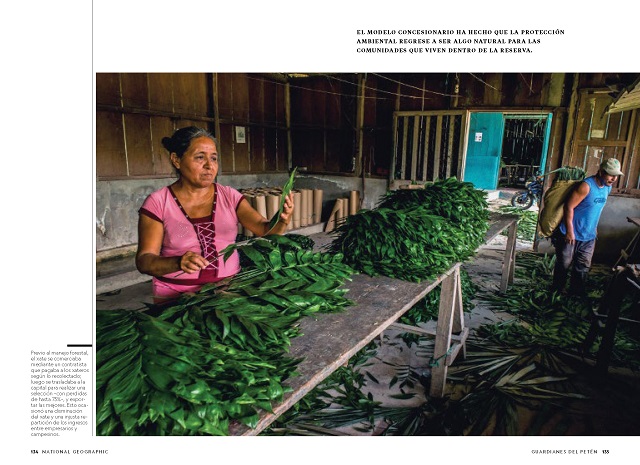 El reportaje de NatGeo destaca el aprovechamiento sostenible de las maderas de la región de Petén, así como otros recursos del bosque como la palma de xate y la semilla de ramón. La reinversión que las comunidades realizan con las ganancias generadas por el aprovechamiento facilita el acceso a la educación y atención médica para cientos de familias -tanto concesionarias como no-concesionarias- permitiendo además una inversión anual de 200 mil dólares dedicados al control y vigilancia del bosque, que se traducen en un índice de deforestación menor al 1% y la prevención de incendios forestales, tala y otras actividades ilegales que amenazan la reserva.