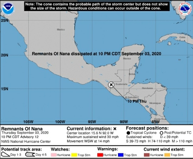 Nana, inició como la Depresión 16 en la temporada de Huracanes del Atlántico 2020, el 1 de septiembre se movilizó por el Mar Caribe y ese mismo día tomó fuerza y se convirtió en la Tormenta Tropical Nana, el 2 de septiembre pasó a Huracán Categoría 1 poco antes de llegar a Belice, horas más tarde el 3 de septiembre, el ciclón entra al territorio guatemalteco por Petén, donde perdió fuerza, la noche del 3 de septiembre ya solo quedaban sus remanentes.