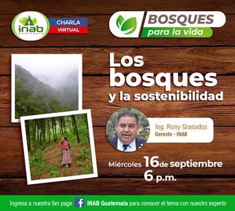 El Instituto Nacional de Bosques (INAB), lo invita a la charla virtual “Bosques para la vida” donde el ingeniero Rony Granados, gerente del INAB hablará sobre: «los bosques y la sostenibilidad».