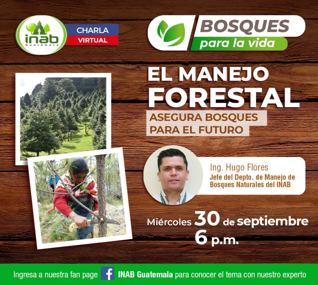 Te invitamos a participar en la cuarta charla virtual Bosques para la Vida, donde el ingeniero Hugo Flores, jefe del Departamento de Manejo de Bosques Naturales de la Dirección de Manejo y Conservación de Bosques del Instituto Nacional de Bosques (INAB), abordará el tema: «el manejo forestal, asegura bosques para el futuro».