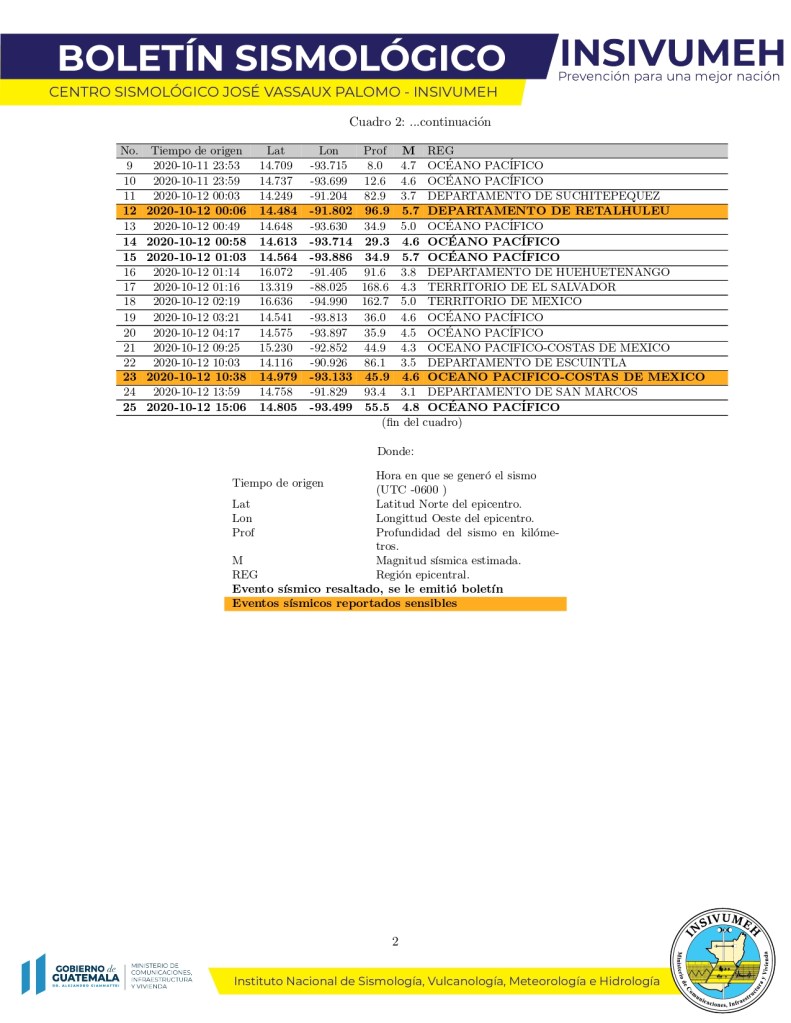 Este año el INSIVUMEH ha registrado en total 2 mil cuatro sismos, de los cuales 65 fueron sensibles. La Coordinadora Nacional para la Reducción de Desastres (CONRED) informó que mantendrá el monitoreo, además hizo un llamado para estar pendientes a la actualización de la información.