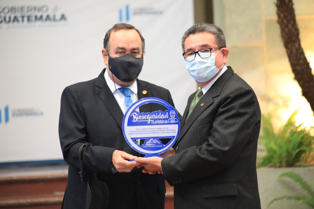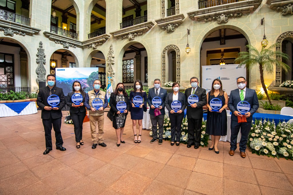 Con el objetivo de reafirmar el compromiso por el cumplimiento de las medidas de buenas prácticas de prevención sanitaria y contribuir a la recuperación del turismo, el Instituto Guatemalteco de Turismo (INGUAT) en compañía del señor presidente de la República, Doctor Alejandro Giammattei, realizaron la entrega del distintivo del Sello de Bioseguridad Turística del INGUAT a las primeras 11 empresas de