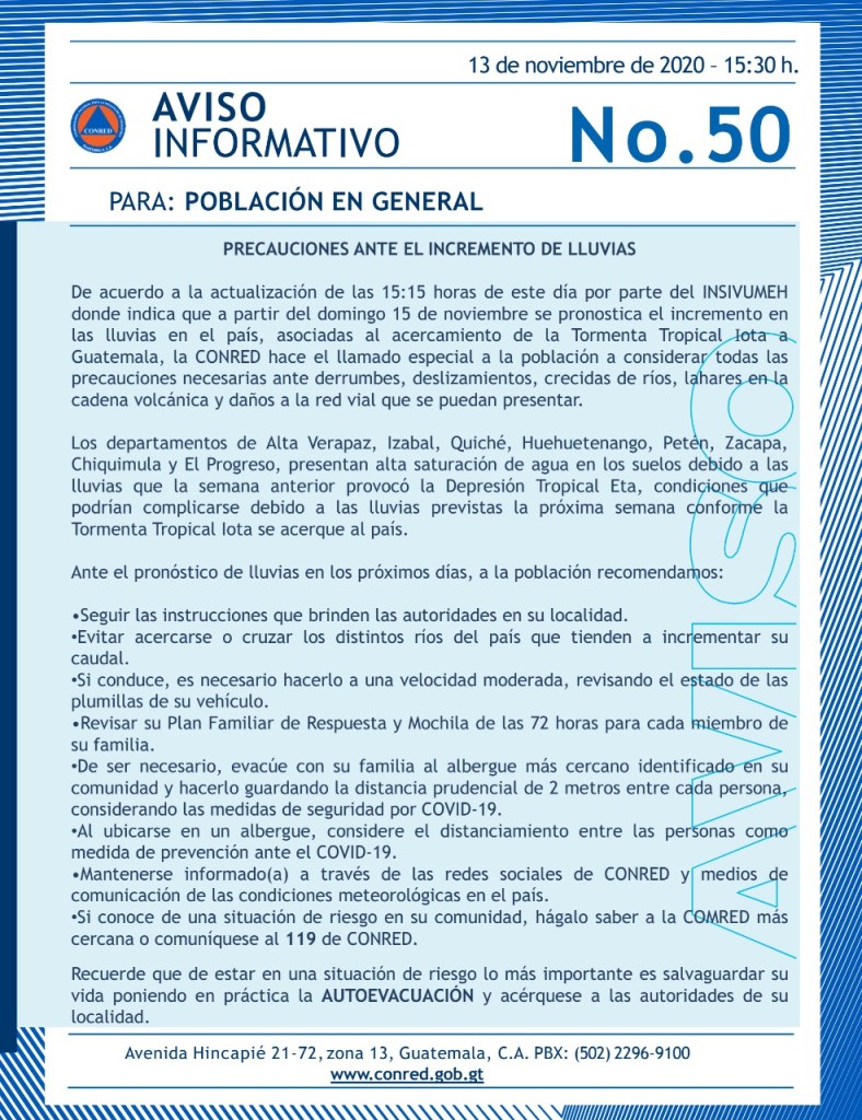 De acuerdo con el Instituto de Sismología, Vulcanología, Meteorología e Hidrología (INSIVUMEH), mantienen el monitoreo, advirtiendo las lluvias que provocará. Por su parte la Coordinadora Nacional para la Reducción de Desastres (CONRED), emitió los avisos, tanto para las autoridades locales de las áreas que podrían ser afectadas, así como para la población en general.
