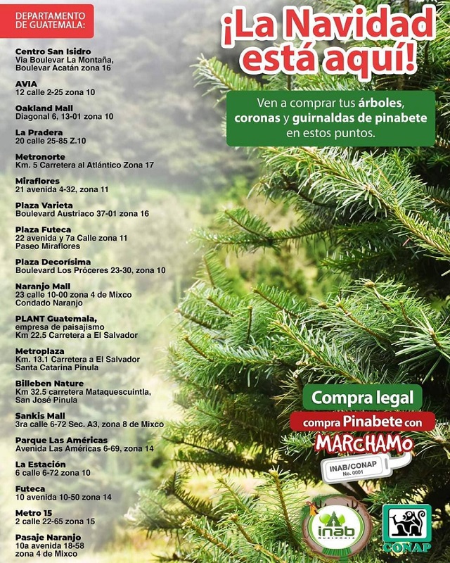El Instituto Nacional de Bosques (INAB), en coordinación con el Consejo Nacional de Áreas Protegidas (CONAP), realizaron el lanzamiento de la Feria del Pinabete que se desarrollará en el Centro Comercial Pradera del 27 de noviembre al 18 de diciembre, en donde los productores de pinabetes, tendrán en venta de forma legal con su marchamo blanco INAB/CONAP.