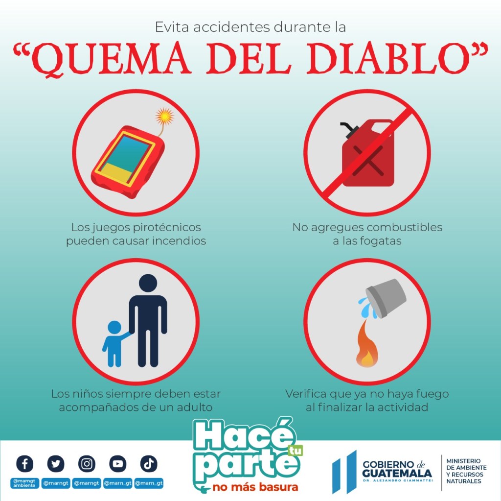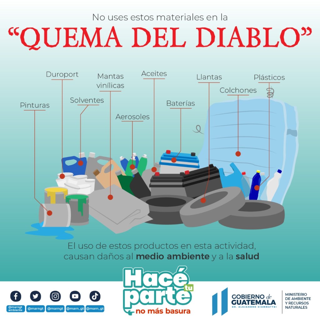 La contaminación ha causado distintos desastres naturales, y para detenerla, el Ministerio de Ambiente y Recursos Naturales (MARN) impulsa la campaña de responsabilidad ambiental por la “quema del diablo”, para hacer conciencia en los guatemaltecos sobre el daño que ocasiona incinerar basura, dispositivos electrónicos, plásticos y químicos, ya que esparcen sustancias tóxicas, como las dioxinas y los furanos.