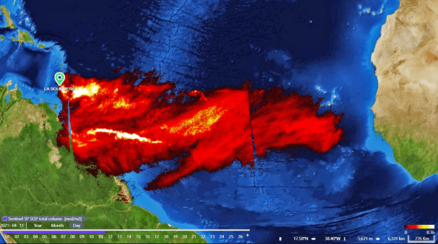 Según una advertencia emitida por los observadores de la Universidad de las Indias Occidentales (UWI), cuando los volcanes lanzan cenizas, el SO2 puede ser levantado por las corrientes en chorro y dispersarse por todo el planeta. El Centro de Investigación Sísmica (SRC, en inglés) UWI expresó su preocupación por la posibilidad que el dióxido de azufre (SO2) emitido por el volcán La Soufriere en San Vicente y las Granadinas se acerque a España y África. Dos imágenes del sistema Copernicus que recoge datos atmosféricos desde 1979 avista que el S02 lanzado por el volcán se mueve a través del Atlántico.