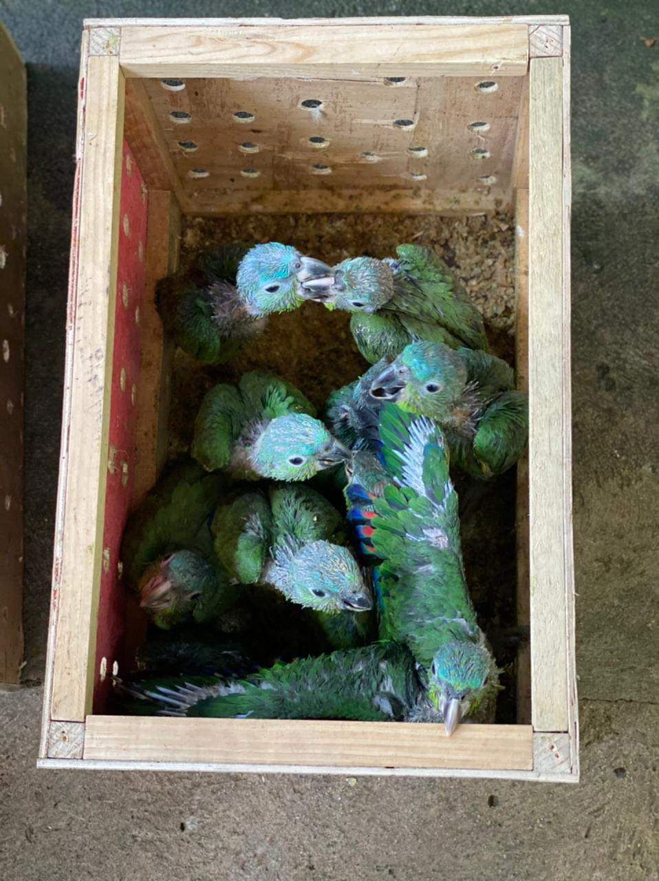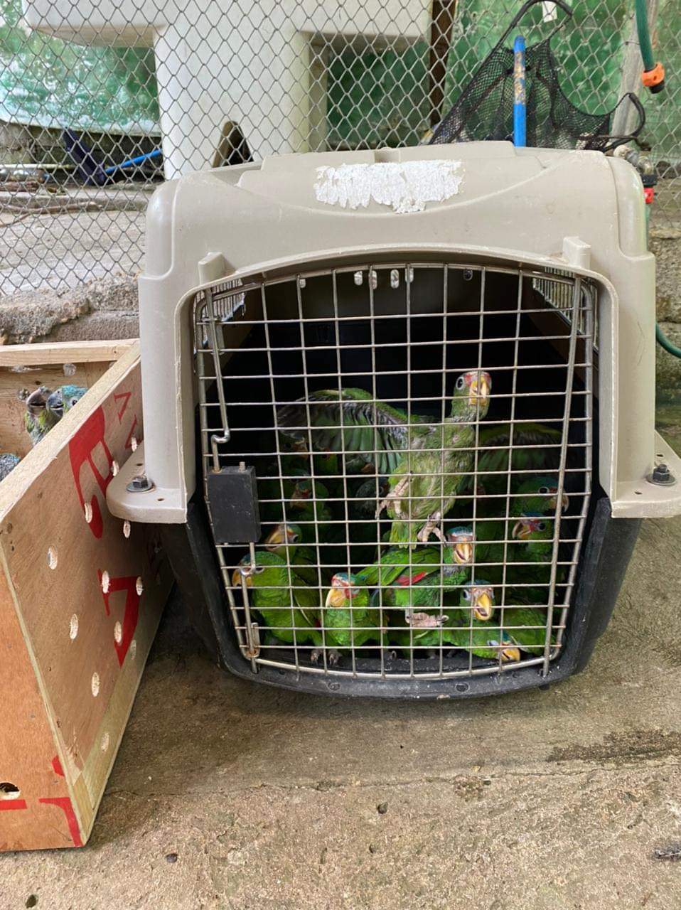 45 loros frente blanca (Amazona albifrons) y 11 loros Cabeza azul (Amazona farinosa) y un mono capuchino (Cebus capucinus), fueron rescatados en un Hotel de Santa Elena Petén, luego de haber sido abandonados por los traficantes.