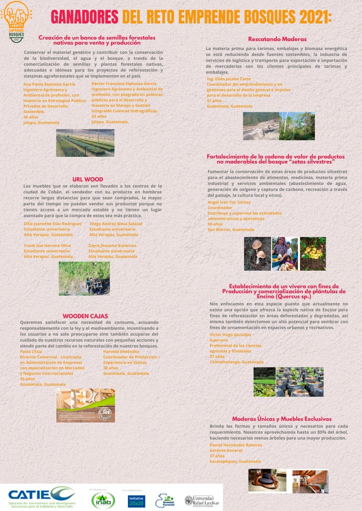 El Instituto Nacional de Bosques (INAB), en alianza con el Centro Agronómico Tropical de Investigación y Enseñanza (CATIE) y con el apoyo de la INICIATIVA 20×20 la Gremial Forestal y la Universidad Rafael Landívar (URL), presentaron a los 6 proyectos ganadores de Emprende Bosques Guatemala 2021.