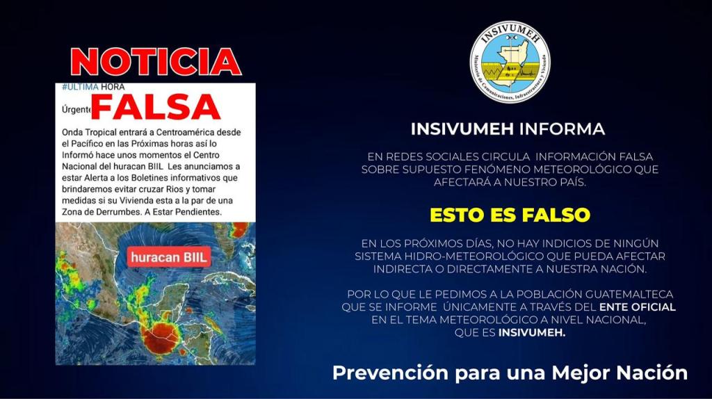 El Instituto de Sismología, Vulcanología, Meteorología e Hidrología (INSIVUMEH), informa de una noticia falsa que circula en redes sociales, donde se avisa de un huracán. Hace el llamado a la población para mantenerse informado de los medios oficiales de esta institución.