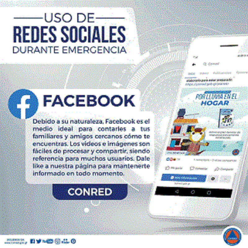 REDES SOCIALES, HERRAMIENTAS UTILIZADAS DURANTE UNA EMERGENCIA. A través del adecuado manejo de información de temas relevantes en redes sociales, la Secretaría Ejecutiva de la Coordinadora Nacional para la Reducción de Desastres -SE-CONRED- promueve la cultura de prevención al emitir recomendaciones para que los guatemaltecos estén preparados durante una emergencia, estas dependiendo la situación o temporada que se presente en el país.