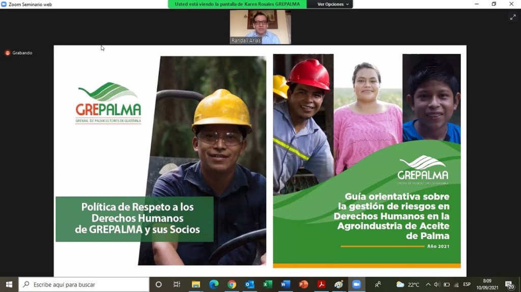 La “Guía orientativa sobre la gestión de riesgos en Derechos Humanos en la Agroindustria de Aceite de Palma” fue lanzada oficialmente por la Gremial de Palmicultores de Guatemala (GREPALMA) en el marco del Programa de Formación de Derechos Humanos que inició en agosto del 2021, tras un año de haberse adoptado la “Política de Respeto a los Derechos Humanos”.