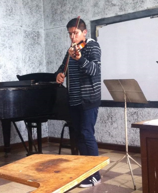 Estudió música en el colegio, aprendió a tocar violín, piano y guitarra, se adaptó en la escuela de música porque los y las docentes ya tenían experiencia en enseñanza a personas en condición de discapacidad visual.