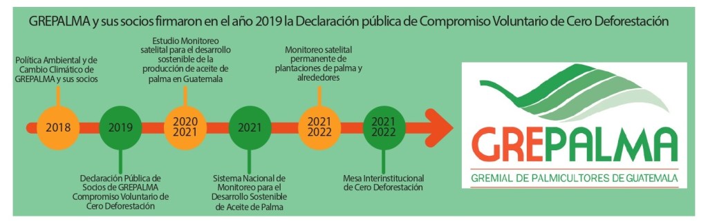 Para cumplir con los Objetivos de Desarrollo Sostenible (ODS), en la acción por el clima, vida de ecosistemas terrestres y alianzas para lograr los objetivos, la Gremial de Palmicultores de Guatemala (GREPALMA) publicó en 2018 la Política Ambiental y de Cambio Climático de Grepalma y sus socios, comprometiéndose con la gestión ambiental, la adaptación y mitigación del cambio climático en toda la cadena de producción de aceite de palma, incluyendo acciones para el monitoreo y evaluación de los avances.