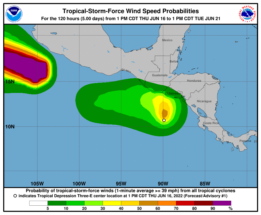 El servicio Meteorológico del Instituto Nacional de Sismología, Vulcanología, Meteorología e Hidrología (INSIVUMEH), informa que el sistema de baja presión ubicado al sur de las costas del pacífico de Guatemala, se ha intensificado a la Depresión Tropical TRES-E.