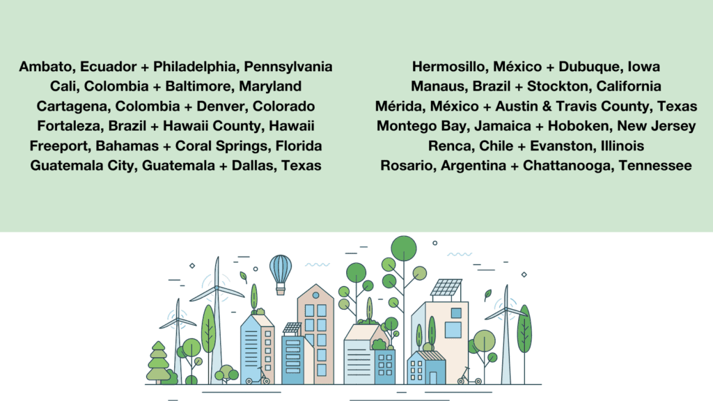 el Departamento de Estado, en asociación con ICLEI-Gobiernos Locales por la Sustentabilidad, Resilient Cities Catalyst y el Instituto de las Américas, se complace en anunciar las 24 ciudades seleccionadas para participar en Cities Forward. Este anuncio es fruto de la Cumbre de Ciudades de las Américas celebrada en abril de 2023, en la que el secretario de Estado Blinken lanzó Cities Forward, la emblemática iniciativa del Departamento de Estado en materia de sostenibilidad urbana que conecta a los líderes locales de las Américas. La iniciativa Cities Forward promueve el compromiso asumido por el presidente Biden durante la Novena Cumbre de las Américas de crear un futuro más sostenible, inclusivo y resiliente en las Américas.