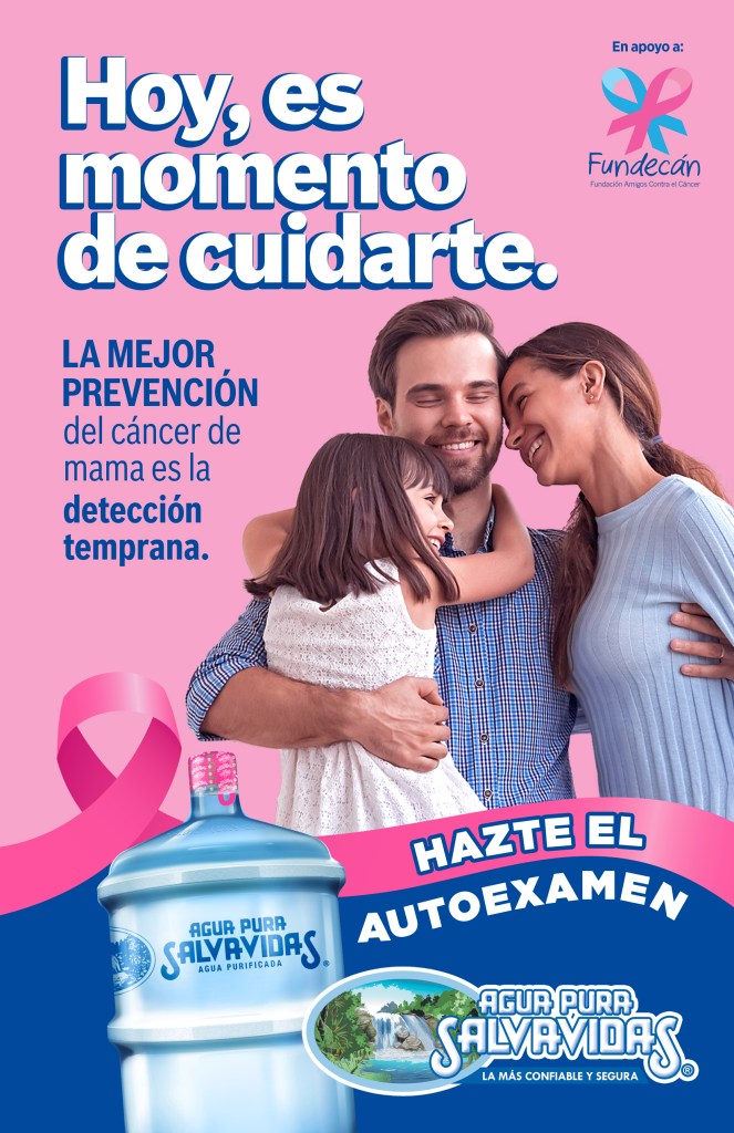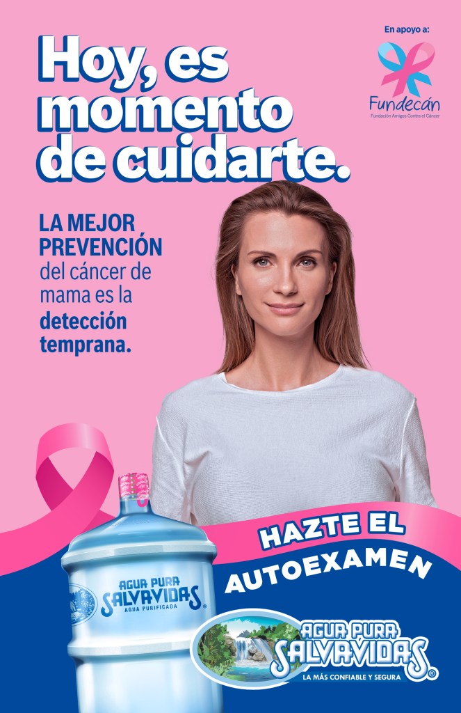 Llegó el momento de cuidarte, es por esa razón que con el lema ¡Hoy, es momento de cuidarte!, Agua Pura Salvavidas y Fundación Amigos Contra el Cáncer -Fundecán- se unen nuevamente para buscar salvar vidas, haciendo conciencia sobre la importancia del autoexamen para la detección temprana del cáncer de mama, apoyando a mujeres de escasos recursos en su lucha contra esta enfermedad.