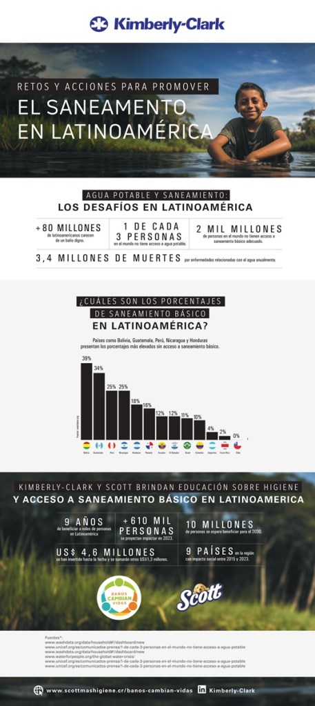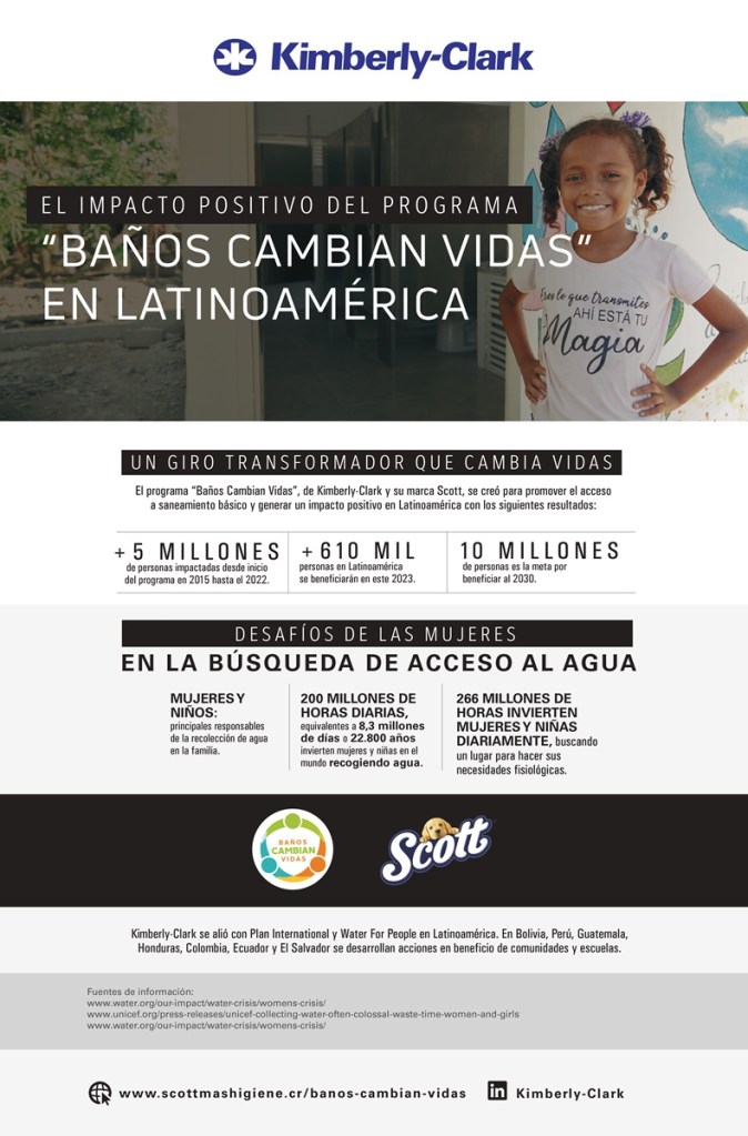 Como parte de su compromiso para abordar esta problemática de saneamiento, este año Kimberly-Clark, a través de su marca Scott®, renovó la alianza con Water for People para continuar con las acciones de «Baños Cambian Vidas» en Bolivia, Perú, Guatemala y Honduras, y continúa trabajando con Plan International para el apoyo a Colombia, Ecuador y El Salvador. Desde su implementación, ha impactado a más de 5 millones de personas a nivel regional, y aspira alcanzar a más de 10 millones de vidas hacia el 2030.