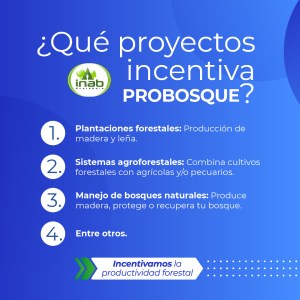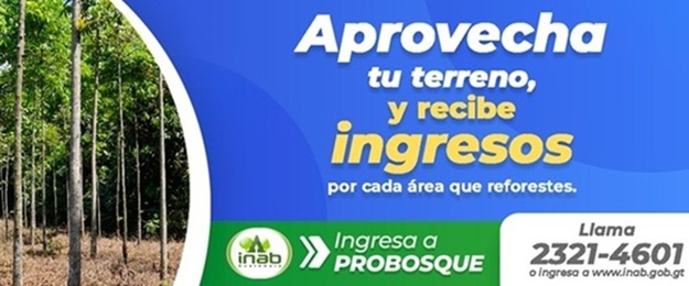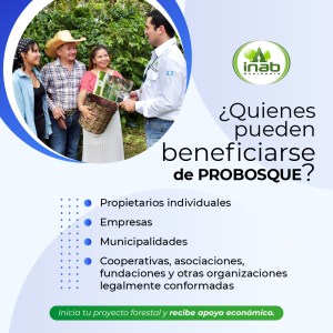 El Instituto Nacional de Bosques (INAB) promueve la participación de propietarios, comunidades y empresas en el Programa de Incentivos Forestales para Poseedores de Tierras de Vocación Forestal y Agroforestal (PROBOSQUE), una iniciativa que busca fomentar la reforestación, el manejo responsable de los bosques y el desarrollo económico sostenible en Guatemala.